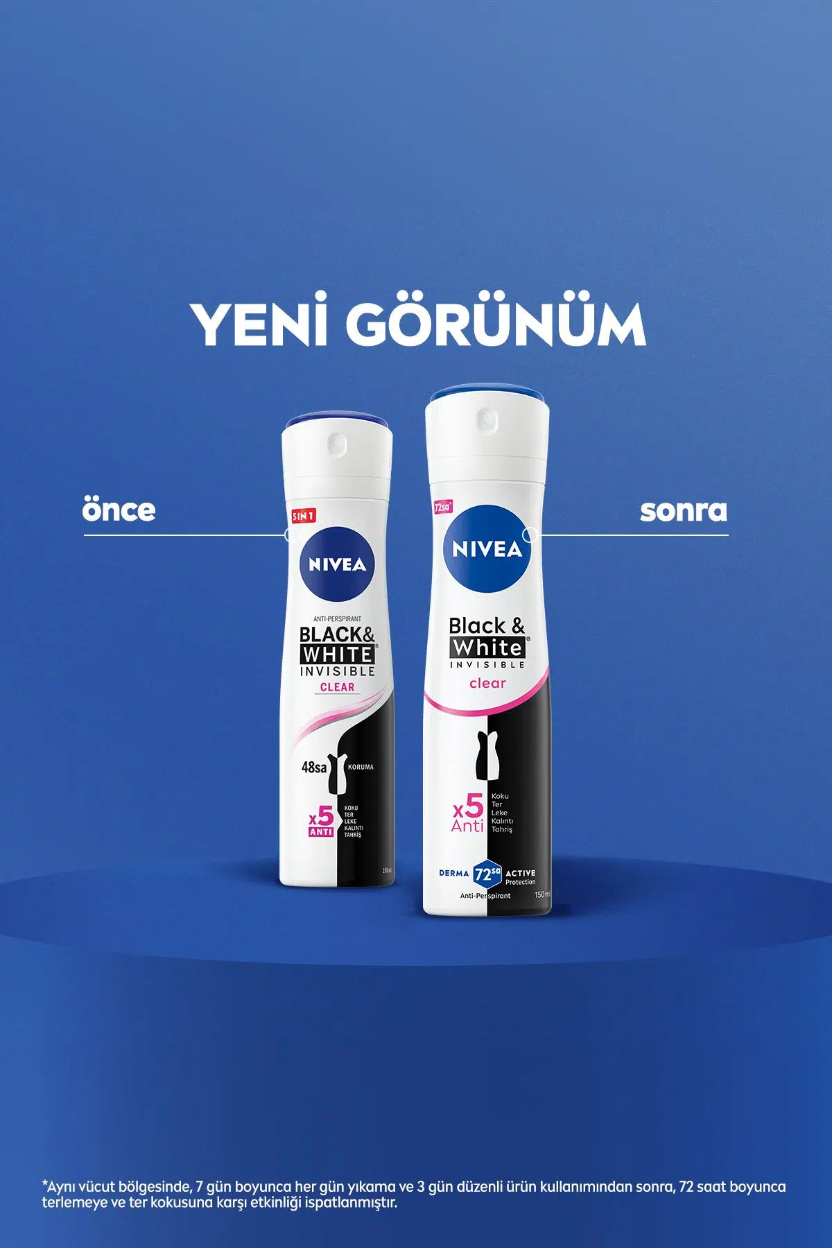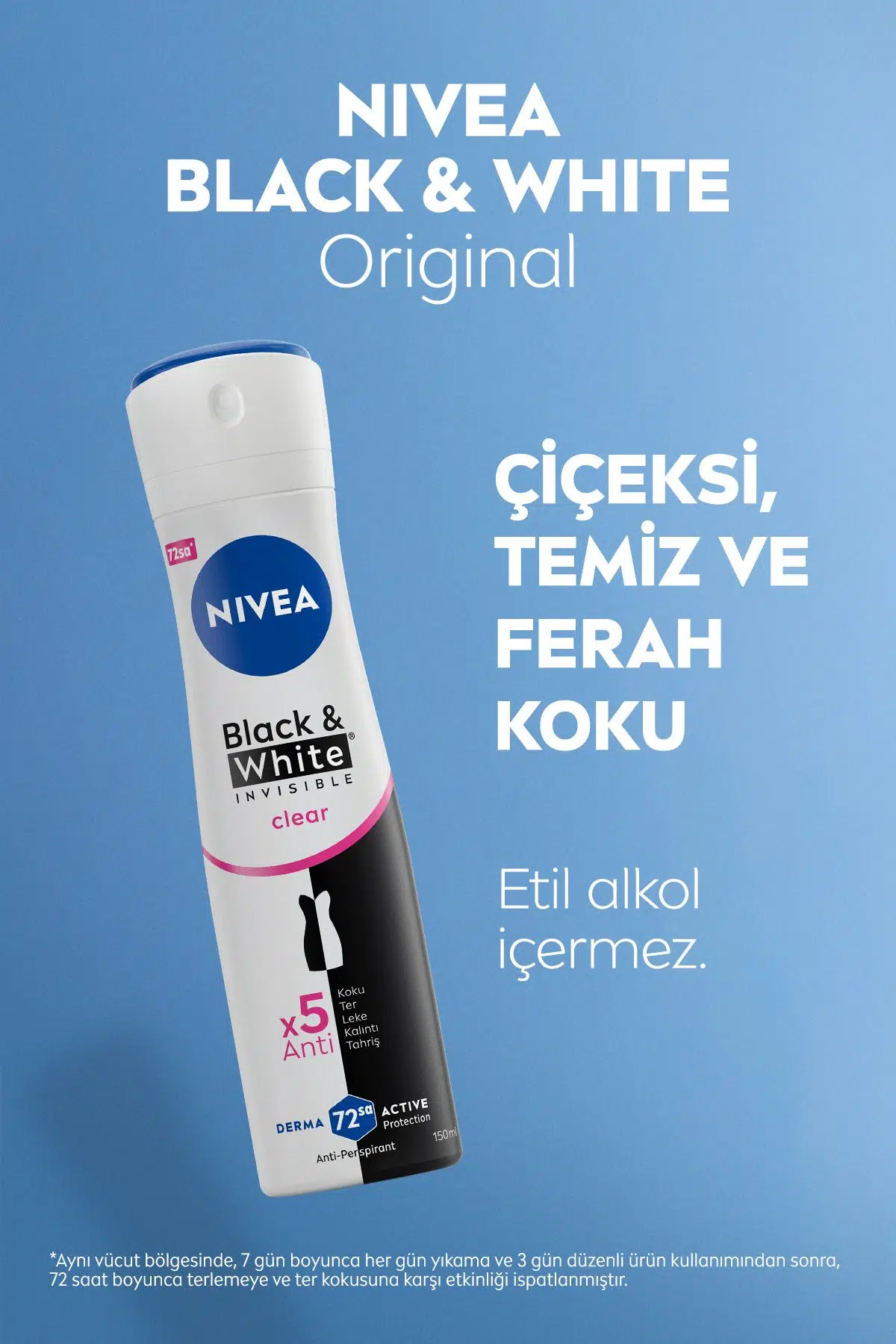 • Dünya’nın 1 Numaralı İz Bırakmayan Deodorant Markası* NIVEA’dan!• NIVEA Kadın Sprey Deodorant Black&White Clear, koyu renkli giysilerde beyaz iz, açık renkli giysilerde ise sarı leke karşıtıdır.